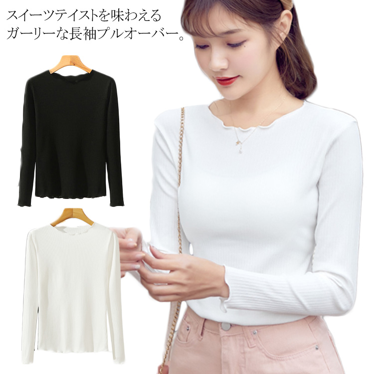 送料無料 フリルが可愛い! リブ プルオーバー 長袖 カットソー レディース トップス 長袖プルオーバー リブカットソー インナー フリル 無地 スリム ストレッチ Tシャツ タイト 細身 秋冬 新作 カジュアル レイヤード 重ね着