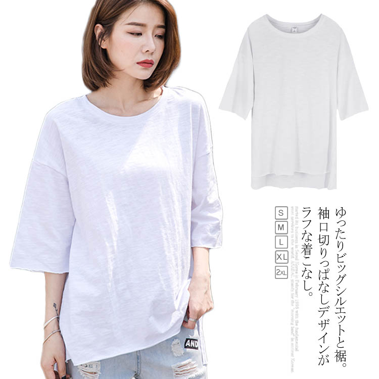 送料無料 天竺綿 Tシャツ 7分袖 ゆったり 無地 ホワイト レディース トップス インナー スリット入り 後ろ長め カジュアル クールネック ゆるシルエット 切りっぱなし インナー 重ね着 レイヤード
