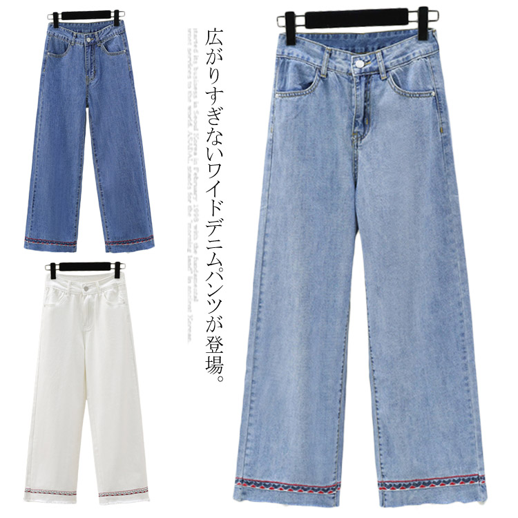 デニムパンツ エスニック刺繍 レディース ワイドパンツ 9分丈 ドレープ ハイウエスト デニムワイドパンツ アンクル ガウチョパンツ コットン 美脚 縦長 大きいサイズ 小さいサイズ
