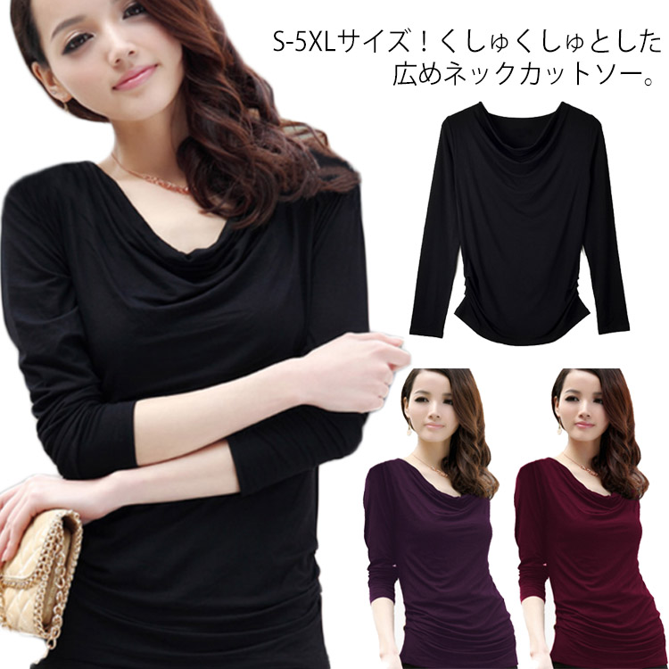 送料無料 S-5XLサイズ!くしゅくしゅネック tシャツ カットソー 長袖 半袖 レディース トップス 無地tシャツ 大きサイズ ストレッチ 伸縮性 柔らかい 春 夏 秋 おしゃれ 可愛い