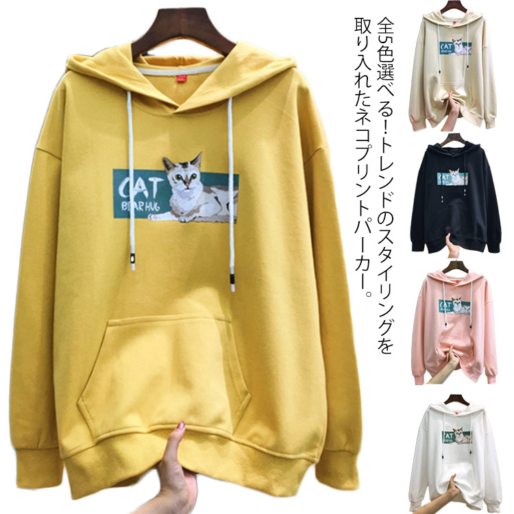 《送料無料》全5color選べる!フードパーカー ねこプリント 猫 ネコ プリント パーカー プルオーバー レディース プルオーバーパーカー トップス カジュアル 通学 春 秋