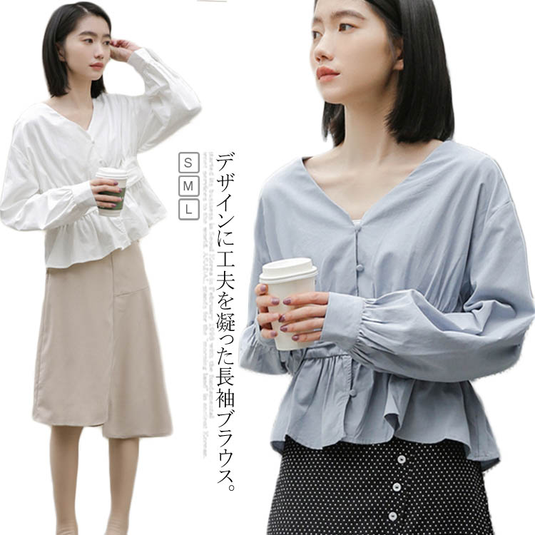 送料無料 長袖ブラウス Vネックシャツ レディース プルオーバー 長袖 ウエスト切替 シンプル レディース フェミニン オシャレ フリル 長袖シャツ カットソー