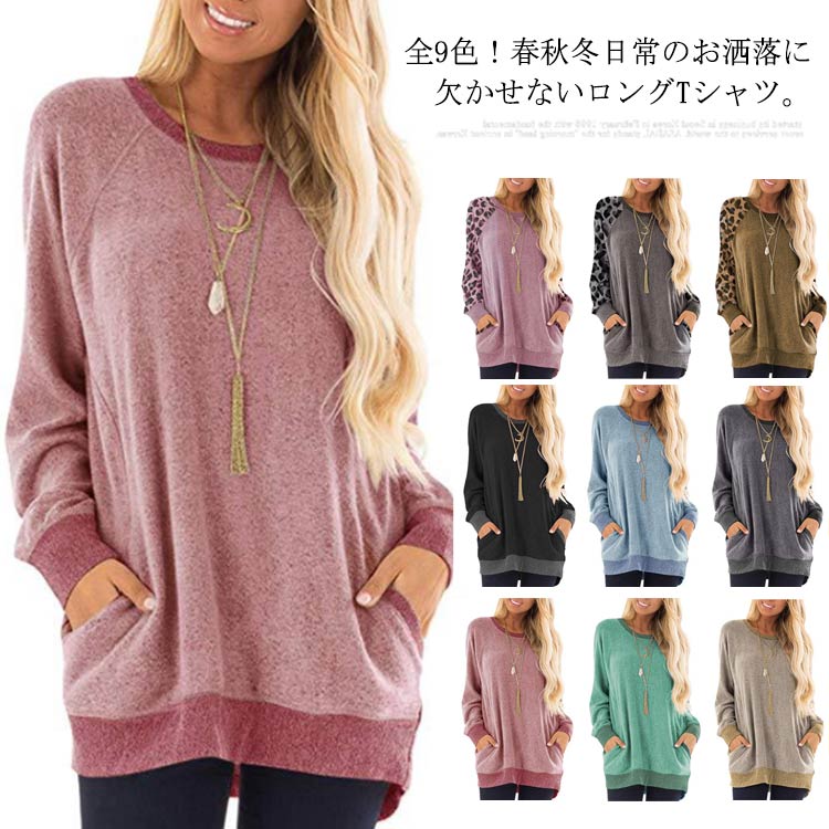 Tシャツ 長袖 トップス ロングTシャツ レディース ポケット付き ブルオーバー ロング丈 体型カバー 秋服 お洒落 全9色 カジュアル