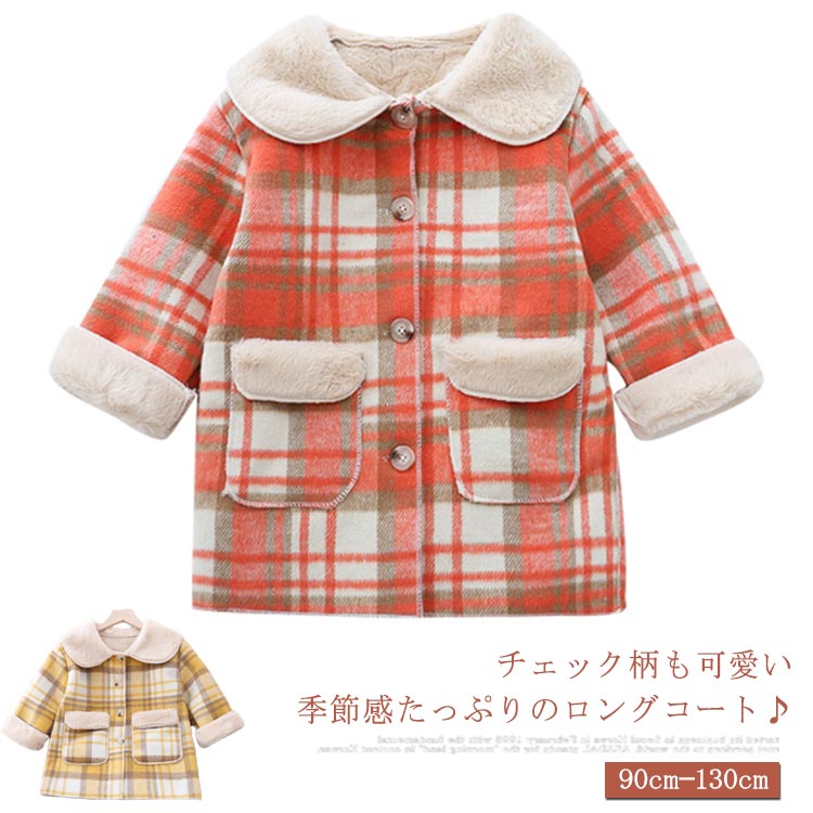ロングコート チェック柄 女の子 アウター 子供服 裏ボア キッズ服 お洒落 可愛い ポケット付き あったか ゆったり 防寒 冬物 90cm 100cm 110cm 120cm 130cm
