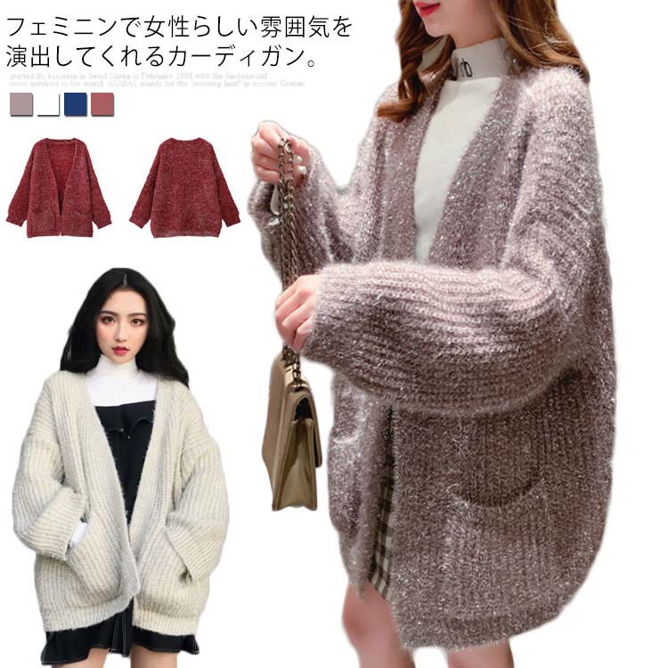 カーディガン レディース モコモコ アウター トップス 前開き ゆったり 体型カバー リラックス感 キラキラ 厚手 秋冬物 ポケット付き 韓国ファッション お洒落
