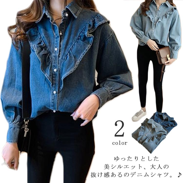 デニムシャツ シャツ ブラウス デニム 長袖 トップス レディース フレア 着痩せ 春秋物 ゆったり 大きいサイズ お洒落 フェミニン感