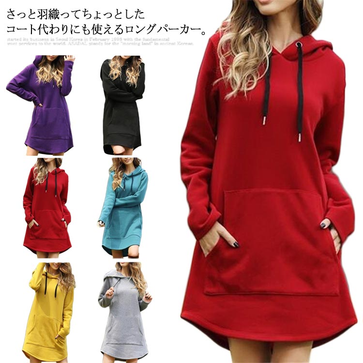 パーカー レディース ロング丈 長袖 フード付き プルオーバー 体型カバー ゆったり 無地 ファション カジュアル トップス 秋冬物 お洒落