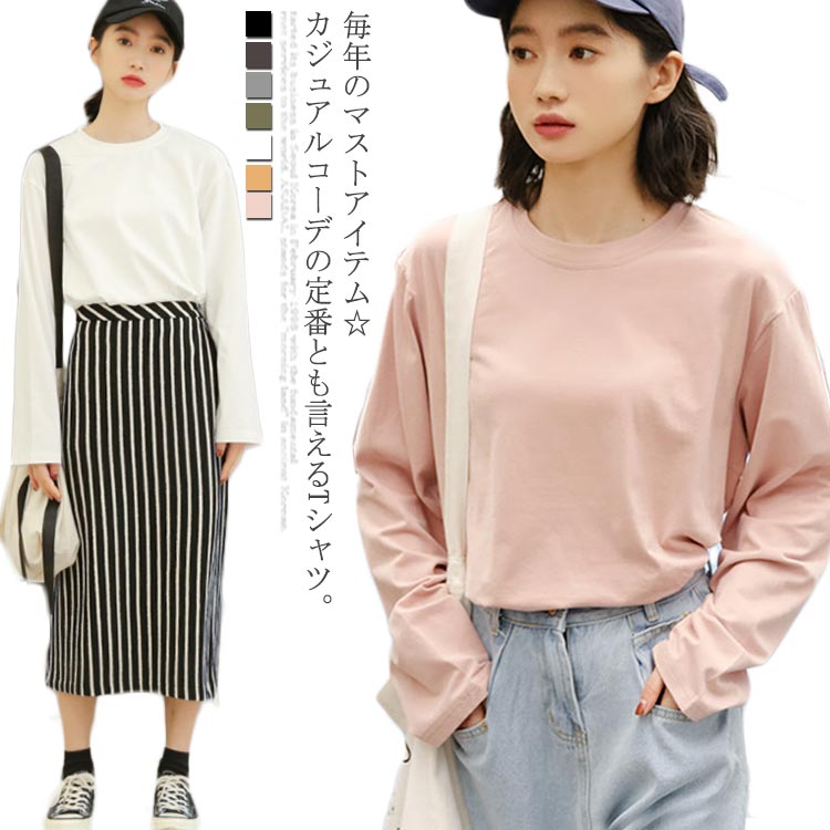 ロンT 長袖 Tシャツ トップス レディース ブルオーバー クルーネック ゆったり カットソー 無地 春秋 韓国ファッション カジュアル シンプル