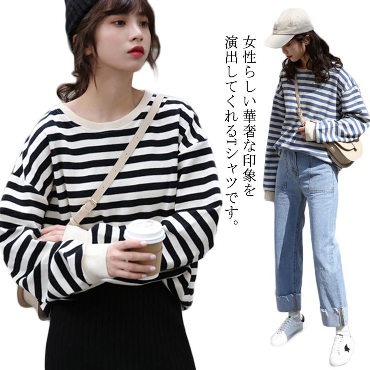 Tシャツ 長袖 トップス レディース パーカー ボーダー ブルオーバー ラウンドネック ゆったり カットソー 秋冬 韓国ファッション カジュアル お洒落