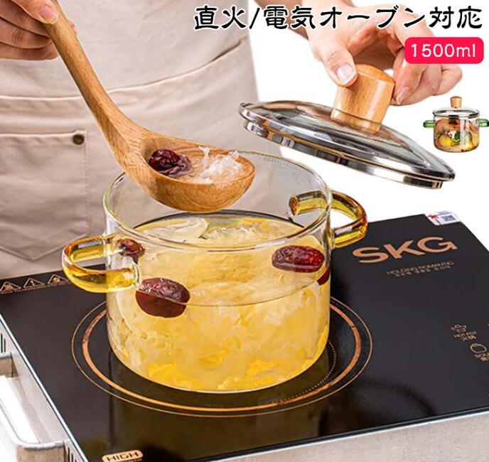 耐熱 ガラス 鍋 直 火 で 使える ガラス 鍋 ガラス鍋透明ガラススープ鍋 家庭料理 木製フタ付き 取っ手付き 電子レンジ対応 直火対応 耐熱性 煮込み鍋 1.5L 焦げ付き防止加工 ガラス鍋 透明ガラススープ鍋