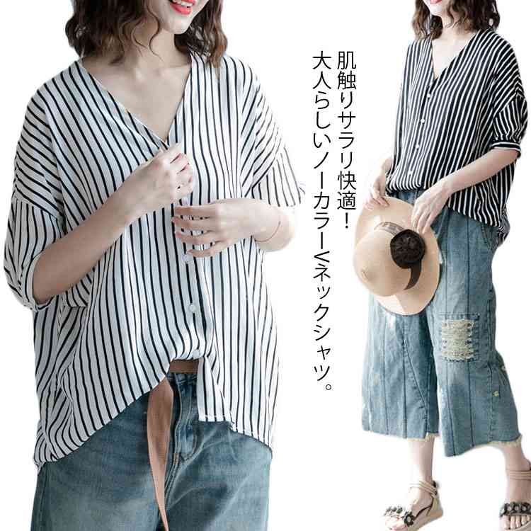 《送料無料》旬のストライプ柄item!シャツ 大きサイズ ストライプシャツ Vネックシャツ 五分袖 半袖 開襟シャツ トップス チュニック Vネック ストライプ柄 夏物 春夏 ゆったり 可愛い